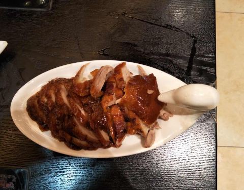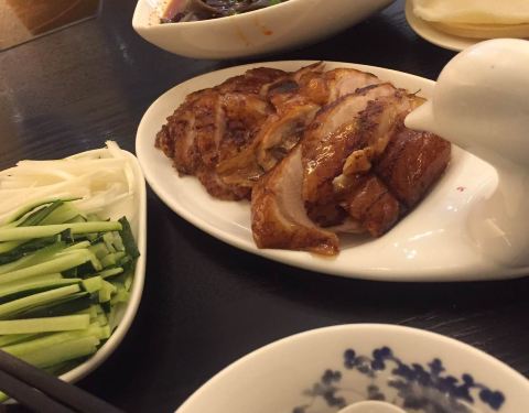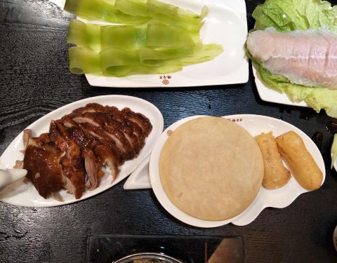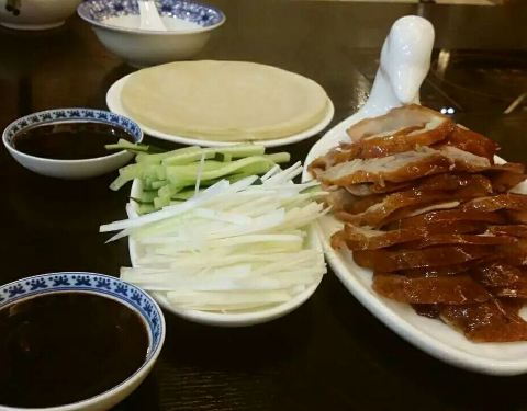 我建议两个人点半只就可以了,一只吃下去还是有点油腻!他们家烤鸭还可以,皮脆肉嫩!薄饼我个人感觉有点厚。但是小火锅不是很行,底料不香,煮出来的菜也不入味!所以建议只吃烤鸭就好了!