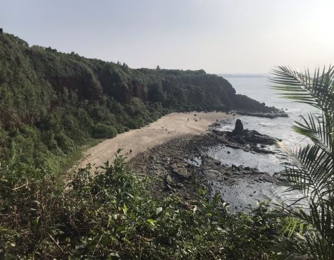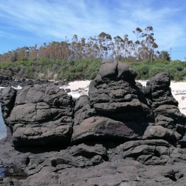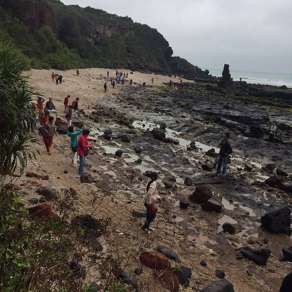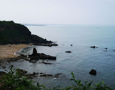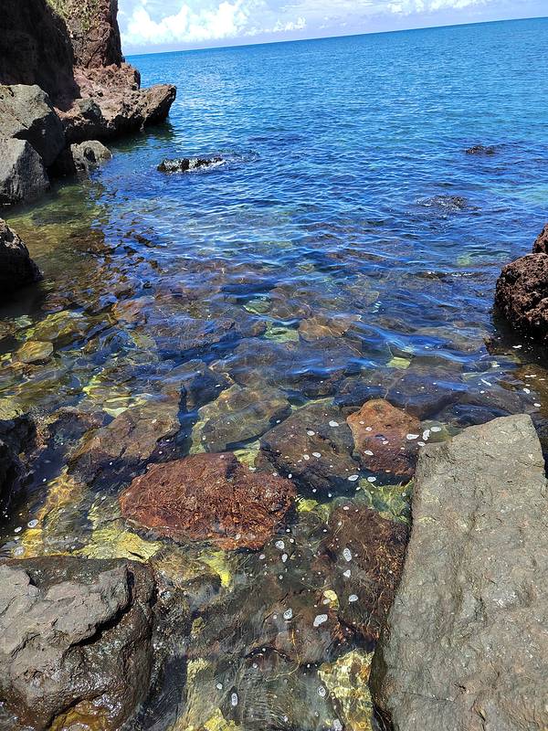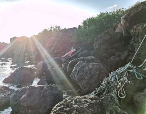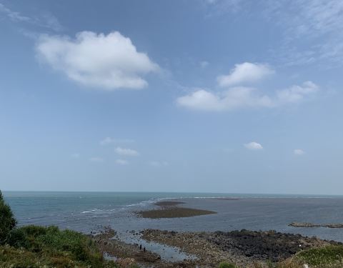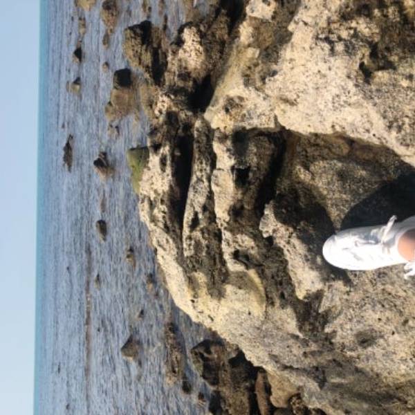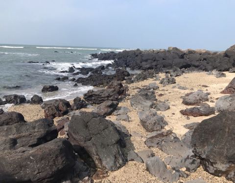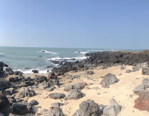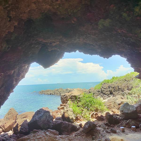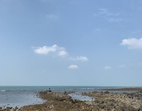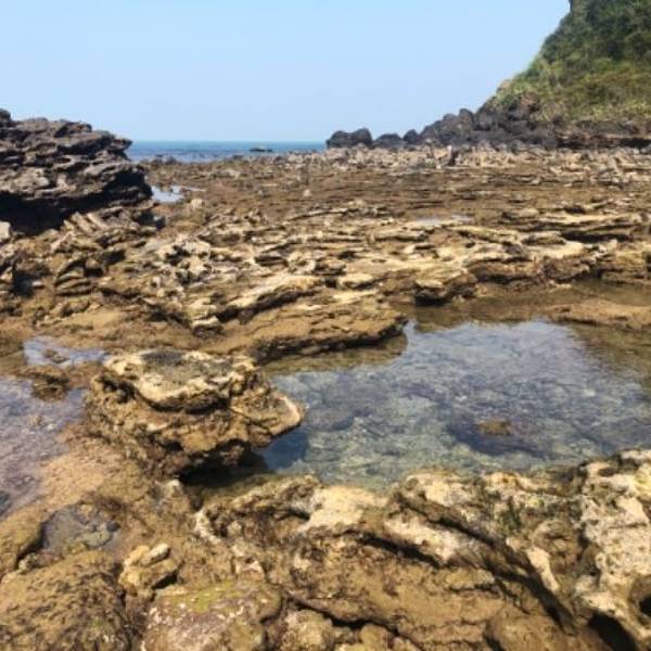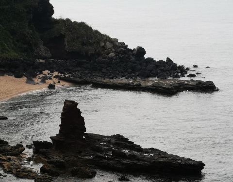 从詹州出发跟着导航来到这里。一个原始状态的景点,火山喷发形成的地貌被海浪冲刷后形成了现在的景像。手脚并用爬下坡,再手脚并用可以来到海边。正好赶上退潮,看见十多个人拿着袋子去石滩上捡海产。