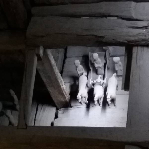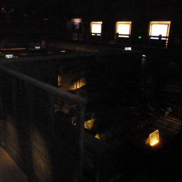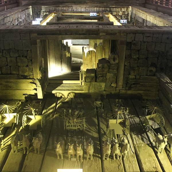 由主殿出来后,东侧亦有一座偏殿,此偏殿下方即为王后陵复原。进入其中,格局与广陵王墓不甚相同。墓前有青铜车马,十分精美,可以近距离观看。