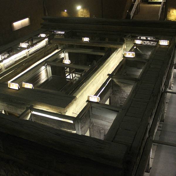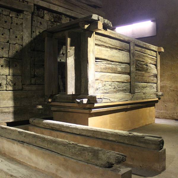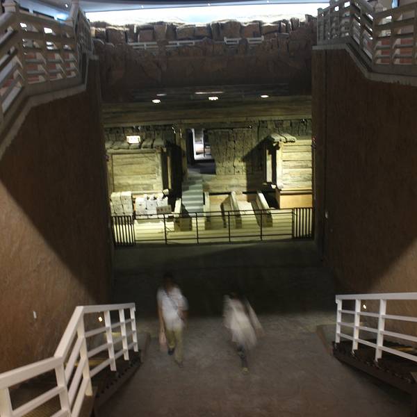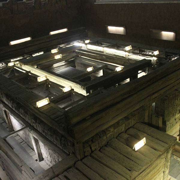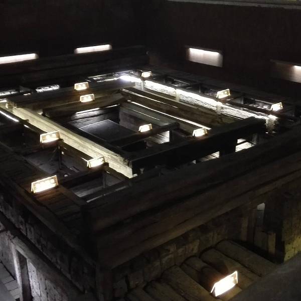 墓葬规模不小,进入店内,寒气阵阵,沿阶梯下楼可以近距离观看墓葬格局,墓葬黄肠题凑,保存十分完好,巨大的木块摆放整齐,规模巨大规整,令人看后十分震撼。墓葬中部梓宫被各式各样功能各异的房间包围。站在高处俯瞰,更能将墓葬格局尽收眼底。不过可惜的是,现在墓葬并不可以进入其中穿梭欣赏。