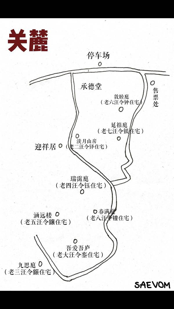 “砖雕”最精华的就是老四汪令钰居所上面的门罩▼关麓景点分布简图地处于武亭山麓,西武岭脚,因西武岭而有着“西武雄关”之称乎。村中的汪性自宋代就在此繁衍生息。八大家是关麓村的核心建筑,顾名思义,就是由他们兄弟八人所建的八座豪华住宅。自古人们都认...▼关麓景点分布简图地处于武亭山麓,西武岭脚,因西武岭而有着“西武雄关”之称乎。村中的汪性自宋代就在此繁衍生息。八大家是关麓村的核心建筑,顾名思义,就是由他们兄弟八人所建的八座豪华住宅。自古人们都认为坐北朝南,才能够冬暖夏凉,但是“八大家的门”大多都是朝北。是因为汉代所流传的“商家门不宜南向,兵家门不宜北向”的说法。