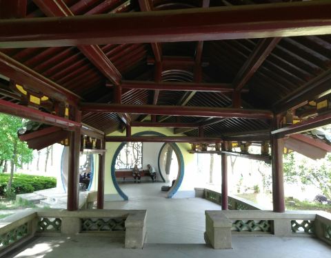 ...建在地势稍高的小山丘上,两边曲廊呈拱形顺势而下,末端建有黄墙绿瓦六角亭,很有特色,气氛典雅宁静