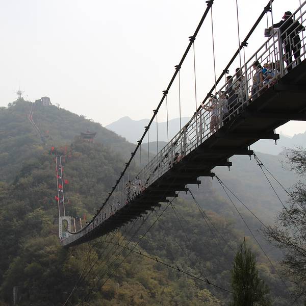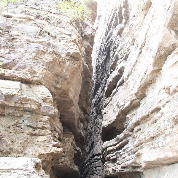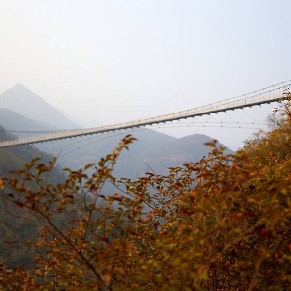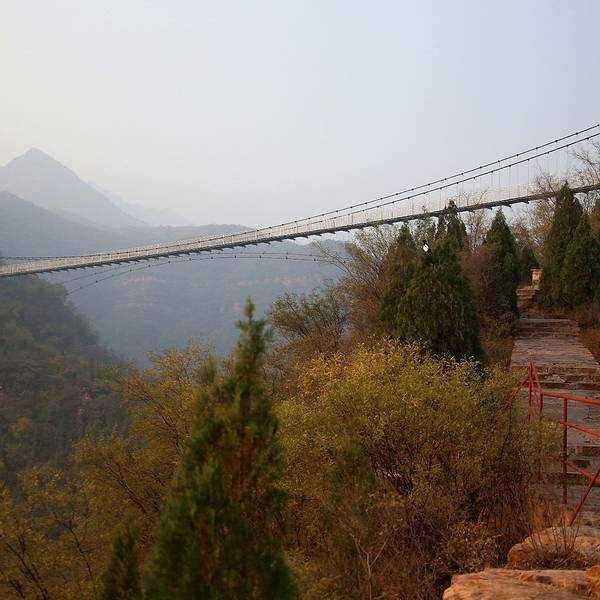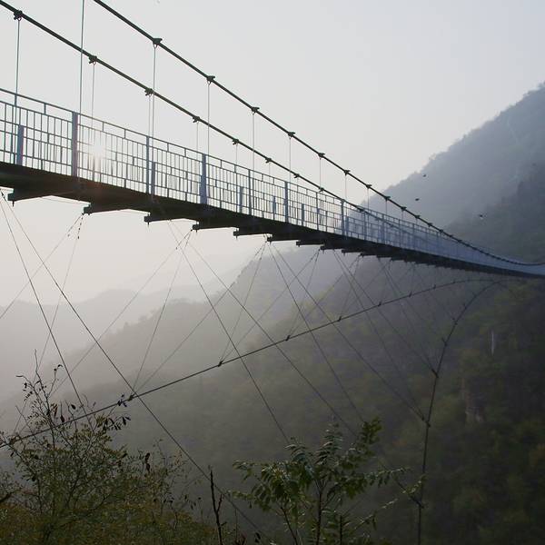 从售票处乘坐游览车先到青年洞景区,再从青年洞沿着悬挂在巍峨雄险的太行山悬崖绝壁之上红旗渠或步行或座小艇返回售票处。由于来得早,步行从验票口沿着红旗渠开始向青年洞前进。天刚擦亮,渠水在夜色中缓缓的流淌,景区里只有我们几个人,仿佛为我们准备的专场。到了一线天,天已经大亮,经过一线天向上走就是络丝潭风景区,除了险峻的天梯,最有气势的就是连接豫、冀两省的峡谷索桥。