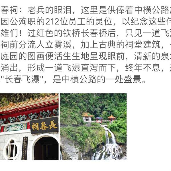 是太魯阁打卡景点之一。长春祠在祖国宝島台湾省,花莲县的太魯阁国家地质公园内长春祠在祖国宝島台湾省,花莲县的太魯阁国家地质公园内。祠内供俸着中横公路施工过程中,因公殉职的212位员工的灵位。建筑采用了唐代风格,依地势嵌入山壁间,清新的泉水自山壁涌出,形成一道飞瀑。是太魯阁打卡...长春祠在祖国宝島台湾省,花莲县的太魯阁国家地质公园内。祠内供俸着中横公路施工过程中,因公殉职的212位员工的灵位。建筑采用了唐代风格,依地势嵌入山壁间,清新的泉水自山壁涌出,形成一道飞瀑。是太魯阁打卡景点之一。 展开