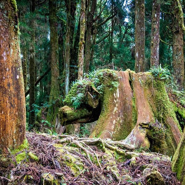三株挺拔的年轻红桧簇生在一起,盘踞在砍伐后的红桧老树头上,越显根基稳固,三兄弟与姐妹潭相呼应。 展开