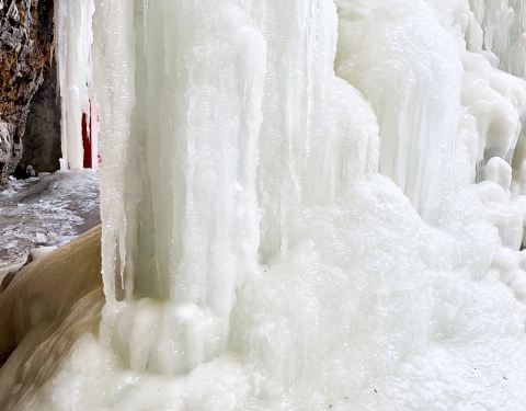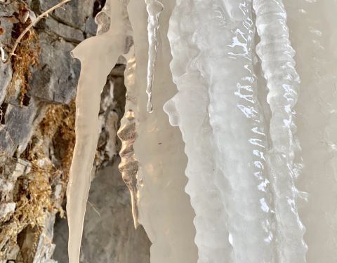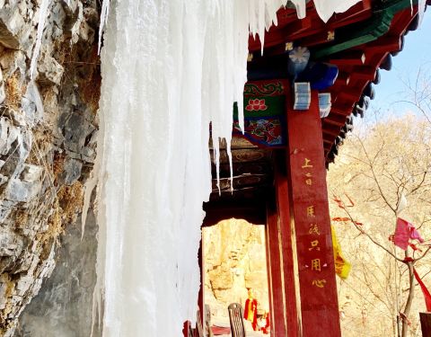 虽然冬天去滴水洞天气有点寒冷,但来这健步锻炼的人还是挺多,其实这里是本溪当地户外徒步的热门地之一哦!而且不要门票! 春夏秋,滴水洞瀑布水流不断,而到了冬季,则滴水成冰,从崖口到谷底,恰似一条倒悬巨龙,非常有气势。 拍照的话,可以进入冰瀑的里层,从里向外看去,一根根如冰锥般在头顶,有些已经断裂掉下,走在下面还是有点胆战心惊的。 悬崖下方山壁上有个小寺庙,也是被冰注包围了,寺庙名叫滴水寺,供奉着几位菩萨,也是祈福上香之处。 虽然冬日色彩没有其它季节那么丰富多彩,但随着人们对户外锻炼的越来越重视,来这里的人也是越来越多,包括骑行爱好者,驴友,徒步爱好者等,不管春夏秋冬,与大自然亲密接触,来山间走走,弯曲的小路,湛蓝的天空,大自然的气息…