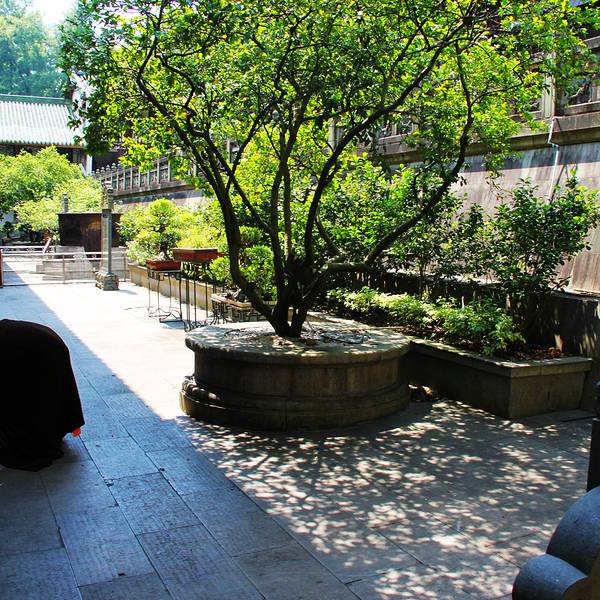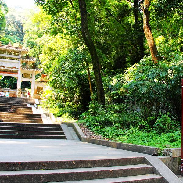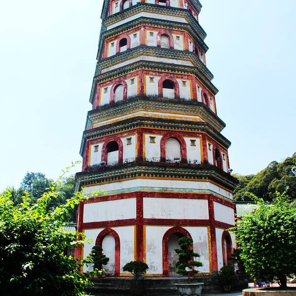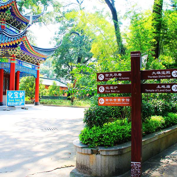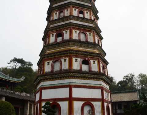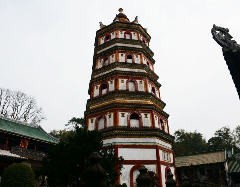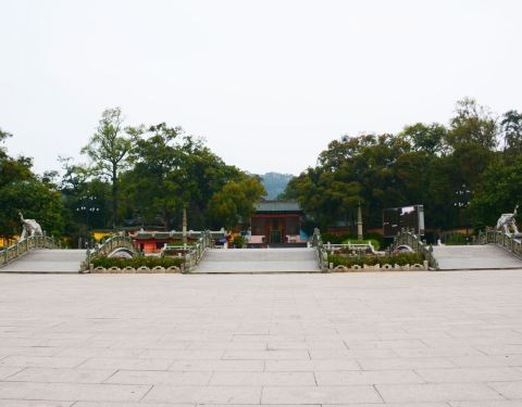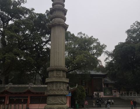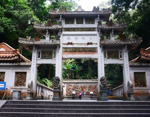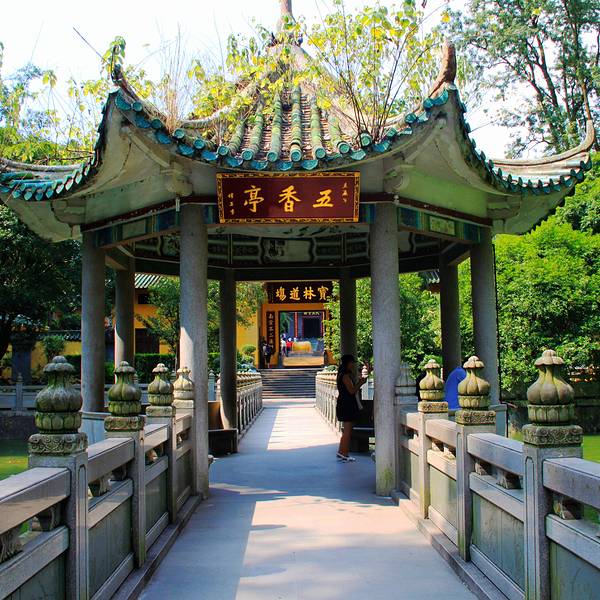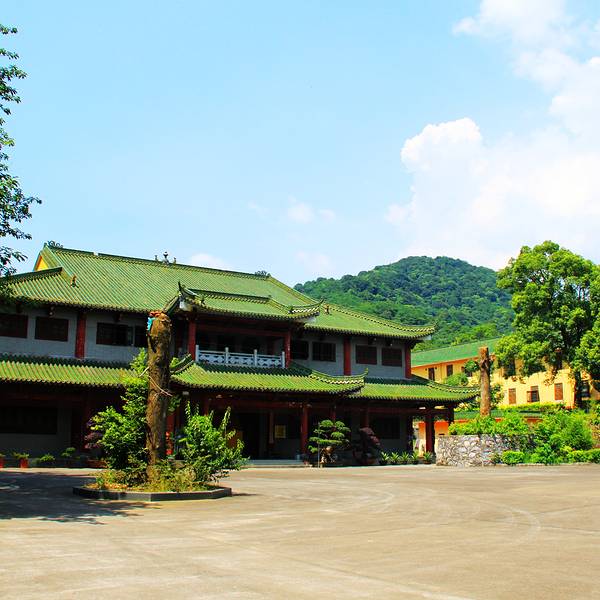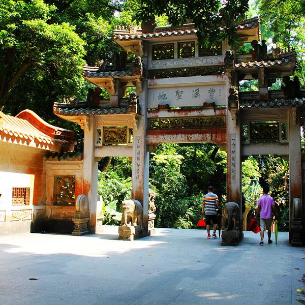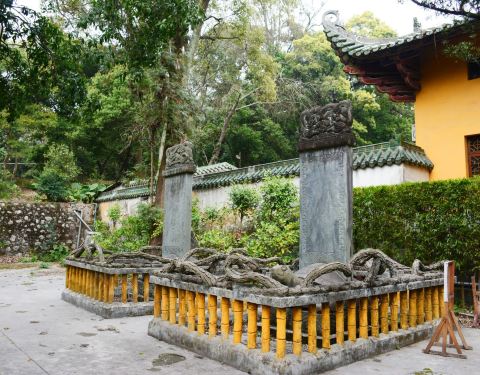 南华禅寺坐落于广东省韶关市,曲江县马坝东南7公里的曹溪之畔,是中国佛教名寺之一,是禅宗六祖惠能宏扬“南宗禅法”的发源地。 迈过高大雄伟的牌坊,就看见了古木护持下山门上的“曹溪”二字,这就到了“三门”。 一进三门,便是“五香亭”与放生池,池中许多乌龟在悠哉地游动。穿过小巧别致的“五香亭”和放生池,可望见二门门楣上“宝林道场”四个大字匾额。门的两旁有“东粤第一宝刹,禅宗不二法门”的对联。二门内建有壮观的天王殿,殿内供奉弥勒佛,两侧为四大天王塑像。天王殿的背后都有韦驮像。南天王殿背后为一处布置精巧的小花园,园内东西两边有钟楼、鼓楼。再往后走,北面丹墀大雄宝殿,大殿正中供奉释迦牟尼、药师、阿弥陀佛。大殿之中墙壁上雕刻有五百罗汉像,往后走,三世佛背面一金身观音菩萨手托净瓶。 大殿后面是藏经阁和灵照塔,其后就是祖殿,六祖慧能的真身放置于内。走出殿门,过了伏虎亭和飞锡桥,上台阶,走进写着“天下宝林”石门,便是卓锡泉,可在这里洗洗手,喝喝泉水。卓锡泉西行,不远处就是虚云老和尚纪念堂,上有对联写,“参见祖师必须空心无我,来到佛地总是宿世有缘”。 继续西行,约百米,是虚云老和尚的舍利塔。礼拜之后,绕塔一周,记载的是虚云老和尚的生平事迹。继续前行,便走到古无尽庵,过了尼姑庵后又回到了曹溪门内。