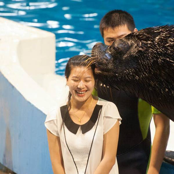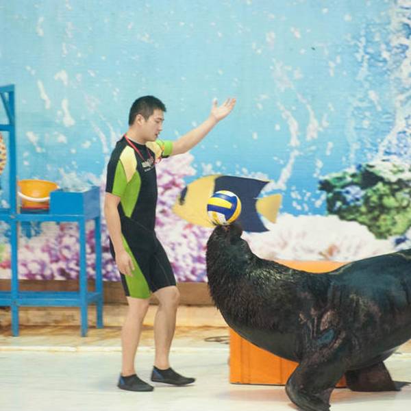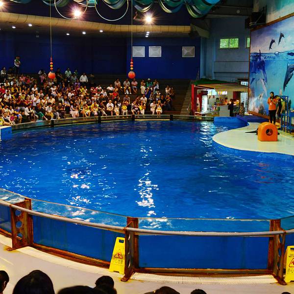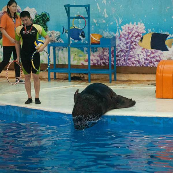 海豚馆可以一次性容纳1000多人观看海豚表演。海豚训练师把这些海豚儿训练的非常聪明,作出的表演也是很精彩给力的,很值得来看一看的。