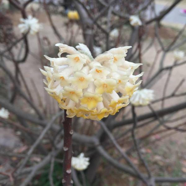 映衬着枯枝灰墙雨幕,分外显眼。