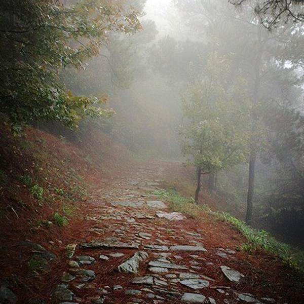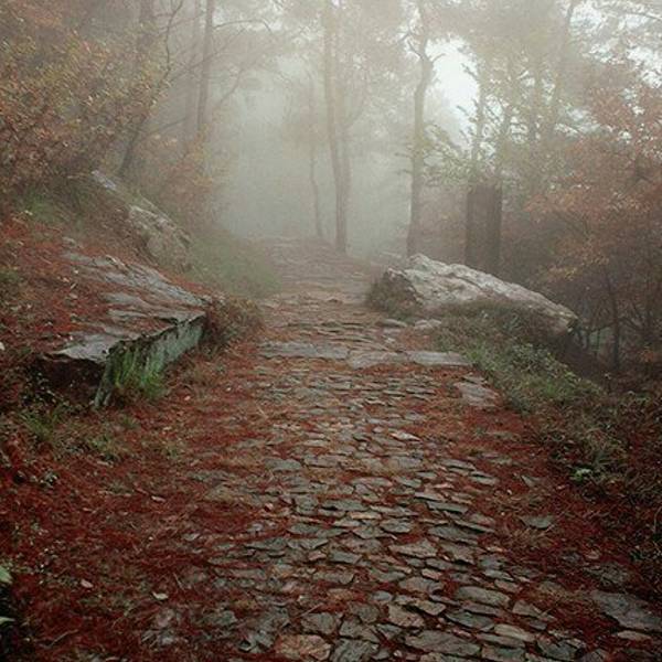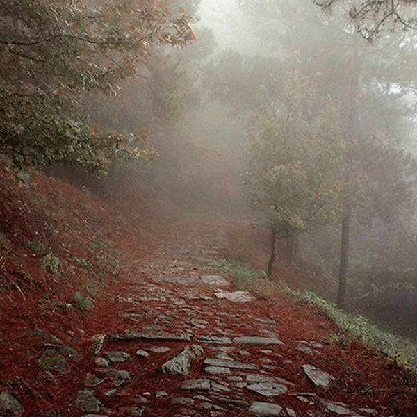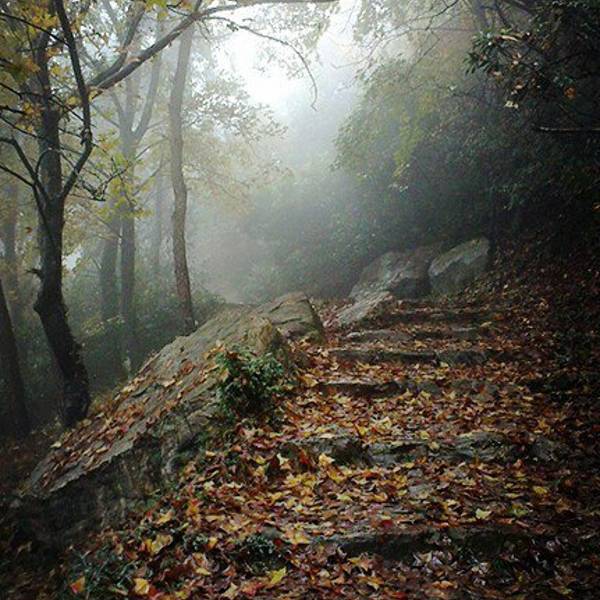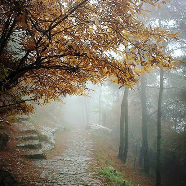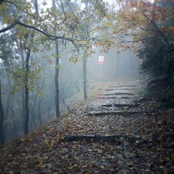 落满石阶的落叶松针被雨水洗刷的分外艳红;往下走一点,不知名的黄里泛红的枯叶取代了落叶松铺成了一条五彩的地毯;再往下走一点,落叶松混合着落叶,在这雨下的步道里,为我描绘着醉人的图画。而山里浓的化不开的雨雾,让前路有种云深不知处的感觉,宛若仙境。
