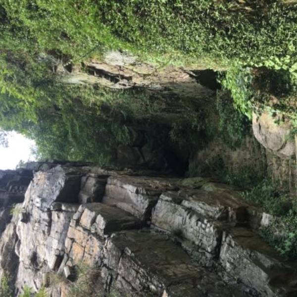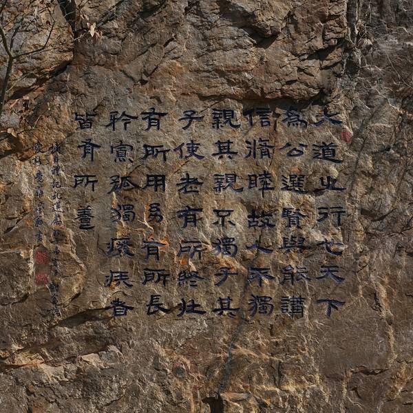 此时,整个山顶之上都被细密的雨水形成的雨雾笼罩着,藏海寺和剑阁,飘渺如虚幻之地。剑阁边的石台上,特地标识着从这里可以看到尚湖景致,不过这样的天气也可想而知,遥望到的只是一片雾气而已。我不甘心就这样离开,于是冒雨(险)从剑阁边的剑门奇石下山。雨天里走仅容一人通过的剑门奇石,尤其是下行是有些危险的。可是当走下奇石,穿过石刻,我不经意之间走入了一条美径。