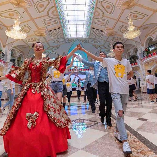 我们还去学习了俄罗斯歌舞: 俄罗斯美丽的姑娘与英俊的小伙子穿着华美的宫廷服装,认真教授了我们电影中才会看到的宫廷舞蹈,在壮丽辉煌的舞厅里,我们仿佛也成了当年的俄国贵族,参加着一场盛大的舞会。