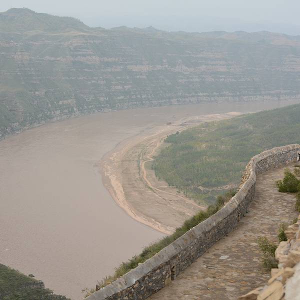 黄河在晋陕峡谷段,总体流向由北向南,在此处陡然向东,转出一道奇特的大湾,俯视该湾,西窄东宽、尾部圆满、南北相称,恰似葫芦状。此湾全长八公里,入湾处与出湾处相距七百米,登高远眺,大湾直欲首尾相连,不知究竟。大湾东岸,壁立千仞,形式险峻。大湾之内,山体如神龟,浮游于浊水之上。