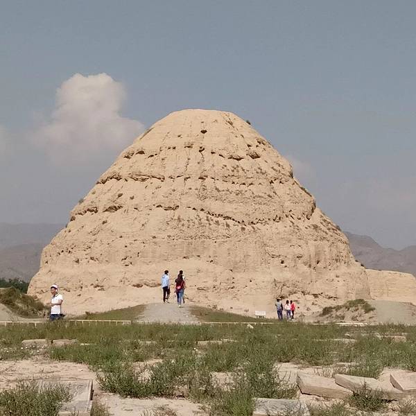 在方圆53平方公里的陵区内,分布着九座帝陵,253座陪葬墓,是中国现存规模最大、地面遗址最完整的帝王陵园之一。我们全靠步行参观,看的也就是最具代表性的一座,位于陵区北部偏东,有一座规模较大的陵邑性质的建筑遗址。普通游客参观的时间不会很久,毕竟王陵一眼就看到了全貌,我喜欢摄影,一直走到跟前,值得看看的有陵台:陵园北高矗立约20米的一个塔状凌锥形夯土台,用黄土密实夯筑而成,八面七级,夯土台有椽洞,还有地下墓穴盗坑。走到跟前才发现遗址内广场、道路、院落、水井和房屋等遗迹都清晰可见,布局十分规范整齐,陵台周围地面散有大量瓦片、瓦当、滴水等建筑物残块。在那里遇到两个学考古的,在讨论西夏文化,他们看着瓦片谈了好久。