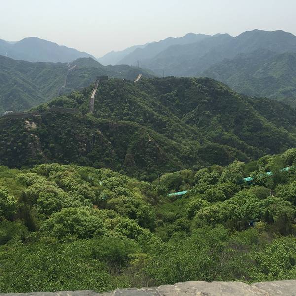 长城门票是40元,往返滑车票价是140元,滑车有点类似于小火车,把人直接从山底送到4楼(八达岭长城一共分8楼),然后游客再爬到8楼。考虑到爬完全程家人受不了而且耗时间就买了往返的滑车,也是蛮有意思的,全程只需5分钟左右。从滑车下来就看到八达岭的登城口,旁边就是传说中的“好汉石”,有很多人挤在这边拍照留念。先来一张远眺图,放眼望去,巍峨的山峦间曲曲折折的长城,在一片绿色掩映下更显雄伟。虽然已过了假日黄金周,但还是有不少人登长城。八达岭段的长城总体来说比较平缓,没有特别陡的地方,而且城墙略宽,视野也非常好。城墙上到处有文明标语提醒大家不要在上面刻画,然并卵,大部分的砖上面都刻了诸如“XX到此一游”的字,不禁令人心寒。因为坐了滑车所以再爬到顶感觉毫不费力,到顶之后坐下来休息补充体力,登长城一定要带吃的喝的,虽然上面也有卖的但是很少,而且都是固定的摊位。我们就准备的非常充足,面包水果饮料什么的带了一包,坐在长城顶上俯瞰美景,吹着山风无比惬意。