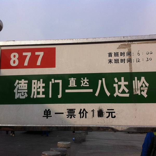 从西直门搭乘2号线到达积水潭再步行至德胜门城楼前的公交车站。一出地铁你会看到很多公交站牌写着去八达岭,也有很多人在排队,但是那些都是野鸡车,非正规的公交车,要认准这个公交车牌才是真的直达车。很多人不知道就在排队了。公交车总站还有好几路公交是直达八达岭的,也可以选乘其他号公交,哪个发车就上哪个就好。