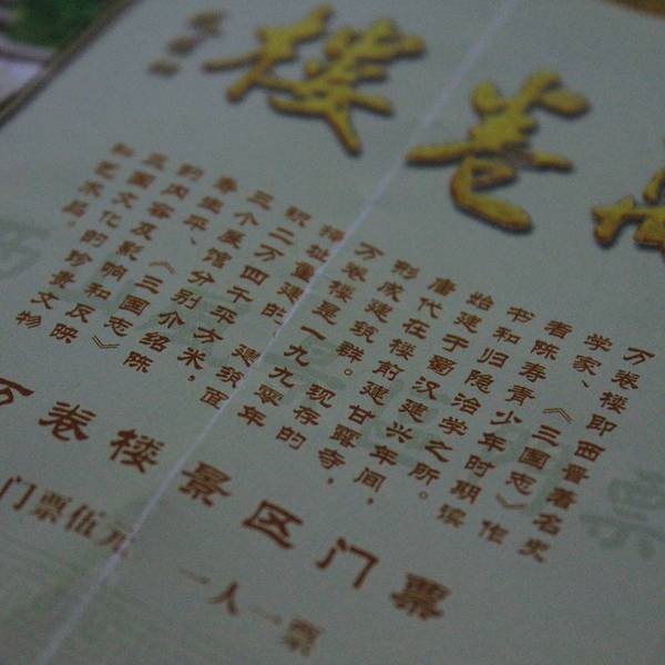 公园门票5元,60岁以上为免票人群,进入公园,便是玉屏湖,里面养殖了很多锦鲤,旁边有商贩兜售于鱼食,3元/包。再往前走,可以看到谯公祠,是个烧香的地方,也可以直接略过。不远处的是讲经坛,只是个雕塑而已,旁边有个游乐园供孩子游玩,继续前行,有个读书台碑刻,旁边就是陈寿旧居,三国志的作者,这里陈列了祠堂以及陈寿写作三国志的情形。之后会看到颇有气势的万卷楼。这里除了藏书,走廊内可有很多三国人物和典故共游客游览,如既生瑜何生亮、赤壁之战等等典故,最顶层的万卷留芳那里可以俯瞰整个南充城的景象,视野和空气都很不错。