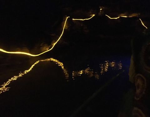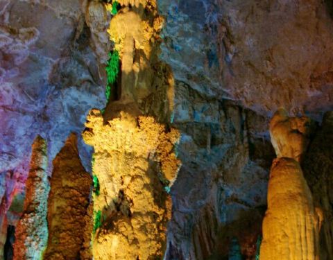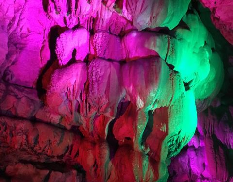 洞内石柱石笋造型各异,似人似神,暗河反射奇幻灯影,美若仙境。推荐