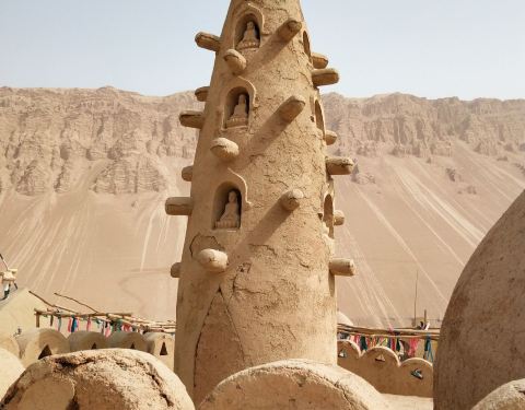 大漠土艺馆位于吐鲁番的火焰山(火焰山景区的背后,导航可到)。由丝路古堡、万佛宫、乡土艺术陈列馆、唐僧殿、牛王洞等几部分组成。建筑极具民族特色,其中也有很多体现现代艺术理念的抽象作品。目前修善中,五一之后开馆。