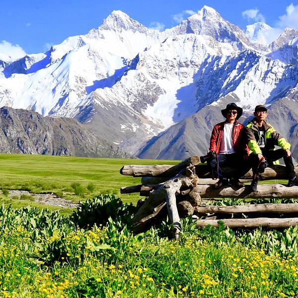8位伙伴,刚好一辆电瓶车,跟管理员说好,每人加多十块加班费,可以晚点去接我们。背上相机坐着电瓶车向冰川出发。半小时左右,到了终点站,伙伴们感觉冰川离我们还太远哇,于是和摩托车司机一翻交战,一百块兩个队员挤一辆车去鲜花坡。在內脏就要颠出来的档,司机说鲜花坡到了,伙伴们扫视四周,花不多,冰川仍然好远,问还能再往里走不,司机说再开一小时,里面有个大平台草原,花更多,雪山更近⋯好吧,每人给多50块,继续推进!