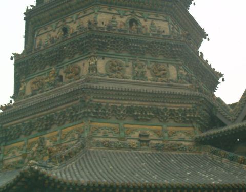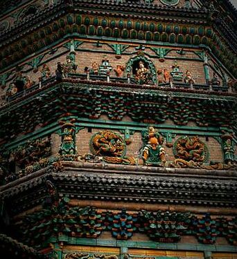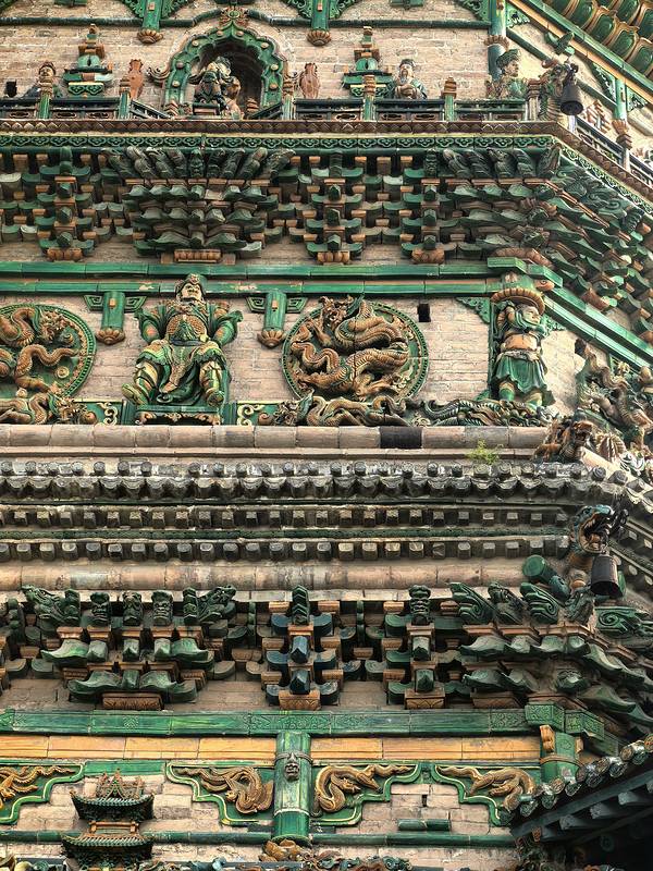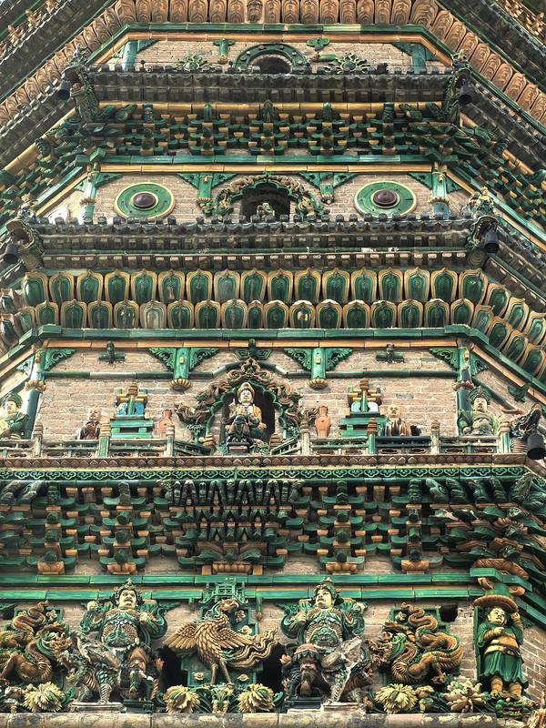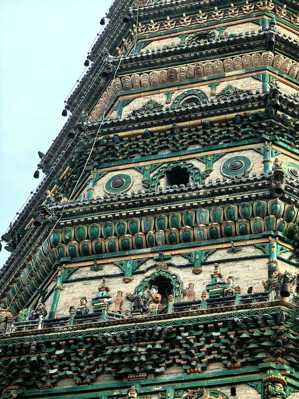 除了塔身全部为砖砌,塔的各层都有琉璃出檐,用七色琉璃装饰,在阳光照耀下熠熠生辉