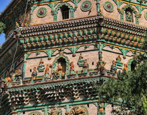 山西省洪洞县城东北的霍山山顶上,八角十三层通高47.31米的飞虹塔,是广胜寺上寺最显眼的建筑,一跨过山门,首先看到的就是它挺拔的身姿。站在塔下仰头观望,飞虹塔像一把直刺云霄的尖锥,每一层塔身上琳琅满目却又错落有致的琉璃装饰,适当地削减了这种锐利之势,增加了圆润的质感。而这些题材丰富的装饰物,也是这座将近500岁的飞虹塔最富盛名的特色。
