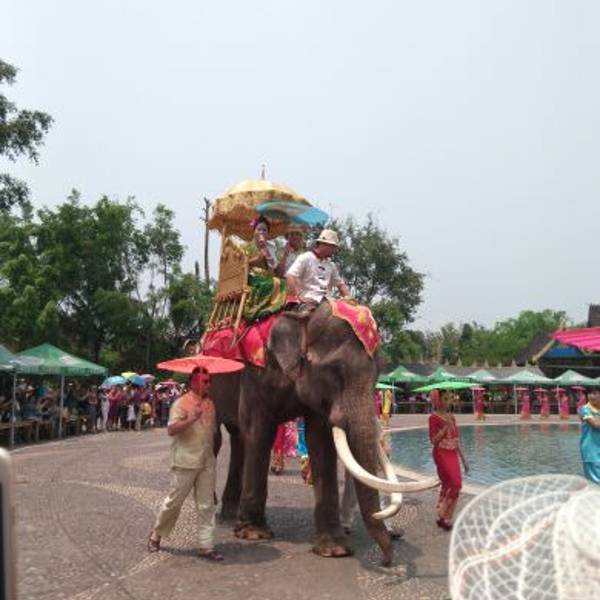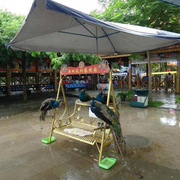 有一个泼水的广场,太商业化了:有些美女穿着华丽的民族服装,没事时闲坐在椅子上,有游客要求照相就纷纷站起来摆出各种姿势,感觉她们就像同样在这个园子里供人拍照的孔雀一样;周围还专门有卖座的,看泼水演出的座。