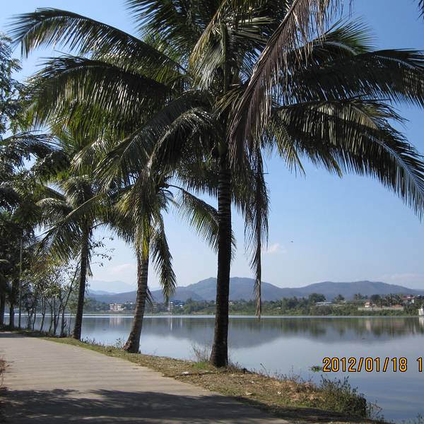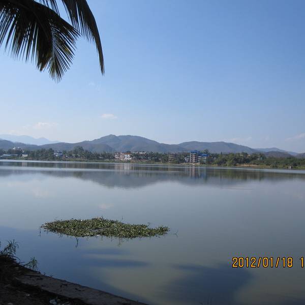 后来我往东穿过种着香蕉的农田,走到一个湖边,估计这里都出了傣族园的范围了。这里又是一番风景,游客到不了这里,只有当地人在湖边钓鱼,我路过时大概他们钓上来一条大鱼,好多人围在一起看。湖边种的同样是热带树,湖那边是山,湖光山色,和园内的拥挤大不相同。 展开