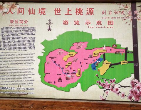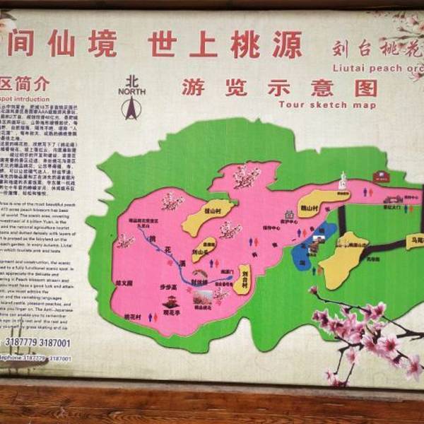 1、刘台桃花源风景区游客服务中心——园林式景观门——农家乐一条街(农家乐餐馆)——麻姑献寿——景区商业街——桃花谷——桃源;