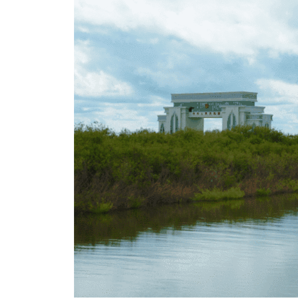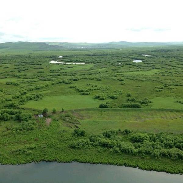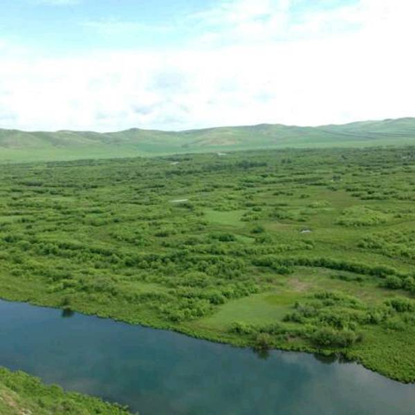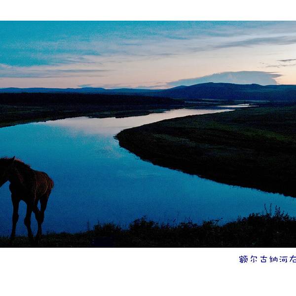 额尔古纳界河 "额尔古纳"是蒙古语,为"捧呈、递献"之意。当海拉尔河从大兴安岭发源,流至呼伦贝尔草原西部赉诺尔北阿巴该图附近时,突然转向东北流去,其形正成165',有如人捧呈递献东西之状,故从此处改河名为额尔古纳河。