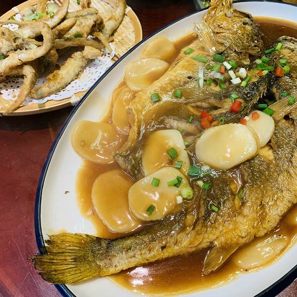 老板的态度很亲切直接坐到你这桌和你一起点菜。一看还以为一起吃饭的呢完全融入毫不违和。还热情的给各种建议。 「茶香排骨」 排骨说实话炸过头了一点油大。肉的部位还行有肉有软骨。茶香味不重缺少一点惊喜。 「竹荪丝瓜」 金灿灿的一道家常菜。想喝汤又无奈太油。 「清蒸白条」 等得最久的菜。鱼还是很新鲜的看到有现杀。 「芋艿小白菜」 芋艿很糯糯啦。整道菜又鲜又油。 梅家坞一排的农家乐饭点人气都挺旺的。他家人气最旺外面装修也最美很显眼。忙起来人手不够来不及收拾环境有些欠佳。桌上的花生瓜子免费提供因为上菜真的很慢呐..味道就很家常的味道食材比较新鲜都偏油。主要是适合人多出来喝茶聊天吃饭不用特地跑过去吃啦。