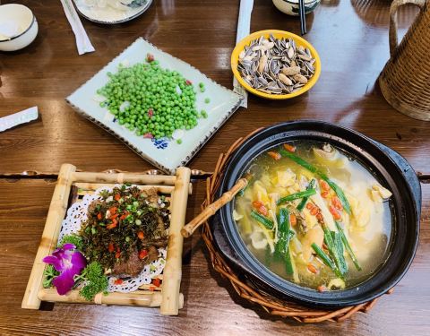 梅坞农家菜飘香 🌟亮点特色: 餐厅环境:去梅家坞虽说穿过梅灵隧道直达,但周末景区单双号限行措施和路途遥远,限制了许多人的出行念头,因此香芙茗农家茶楼也像众多的景区农家餐厅一样,在苦苦地等待客人的光临。尤其是疫情的影响,使得本来平日就不多的客人显得更加冷清。这也逼迫他们釆用各种方法自救。相比而言,香芙茗的装修更精致许多,门外空地搭了大棚供客人们吃饭喝茶休闲。一楼大厅不大,可容五张两人餐桌和一个大圆桌。二楼是包间。环境总体来说挺不错的。 交通攻略:坐103路公交车到梅家坞车站下车,向梅灵隧道方向走百米即到;开车可以停梅家坞停车场。 🕙营业时间:10:00–20:00。 🍽美食攻略: 推荐菜品: 1.钱江鳗鱼(198元):鲜的江鳗,肉质细嫩,十分适合老年人和儿童食用。 2.茶香排骨(68元):茶叶在油锅中炸脆,排骨也炸至金黄色,香郁味美,可惜焦盐放得太多,影响了口感。 3.香肠炒豌豆(48元):当季蔬菜,可以解腻,但是两人的菜量有点多,有些浪费了。 💰人均消费:100元。 🌟亮点特色: 餐厅总分:餐厅环境很自由闲适宜人,菜品味道很不错。 📌小Tips:景区周末有单双号限行措施,不要踩雷!