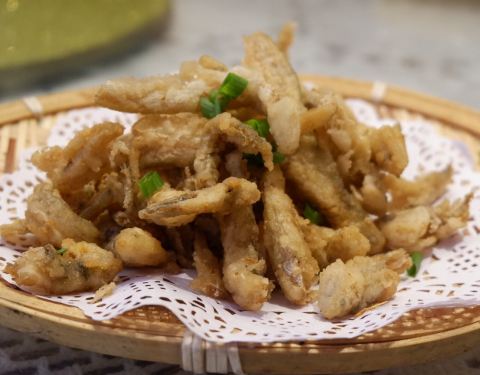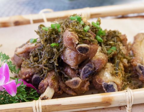 - 2.茶香排骨(68元):茶叶在油锅中炸脆,排骨也炸至金黄色,香郁味美,可惜焦盐放得太多,影响了口感
