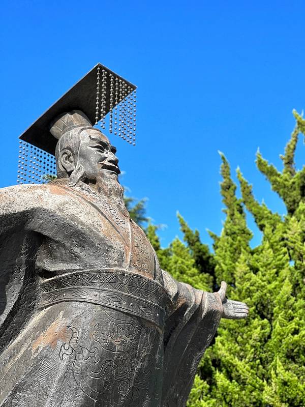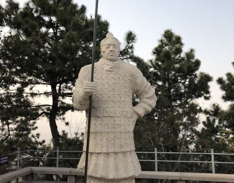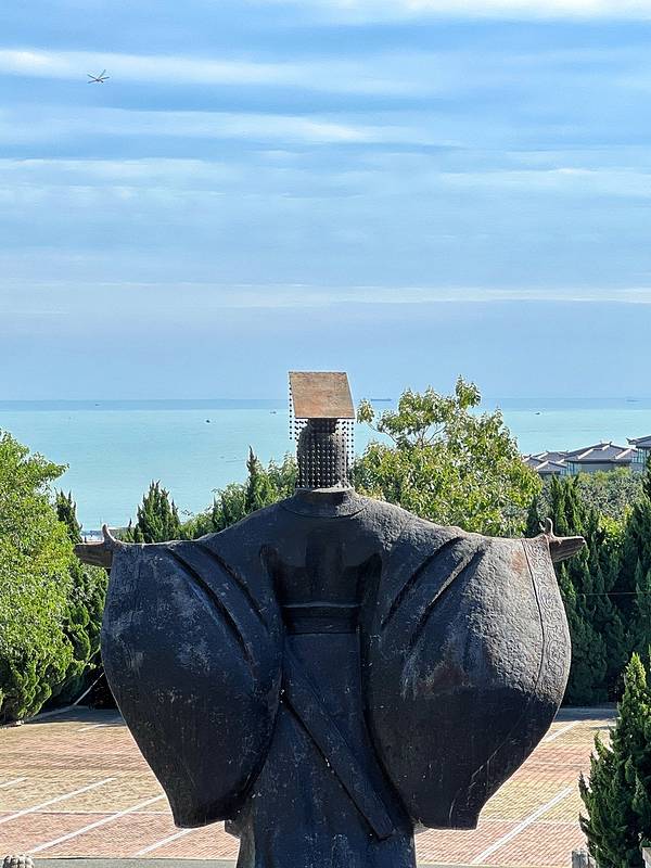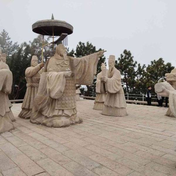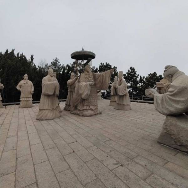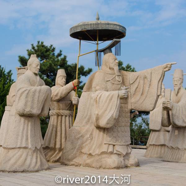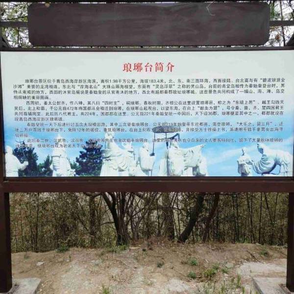 景区并不是太大,其实可以一路步行的,也有电瓶车可以直接带你到山顶的琅琊台,不过就错过中间的风景了。进入距离大门口不远的琅琊台陈列馆内,门口是一尊秦始皇像,秦始皇东巡的时候曾经两次到达琅琊台,而早在秦始皇之前,春秋时期齐国的开国国君姜太公就在这里设立了祭坛,祭祀四时之神。陈列馆并不大,陈列着春秋战国,秦汉两朝前来琅琊台祭拜的国君塑像,从陈列馆的观景平台上可以看到不远处的大海以及小岛。