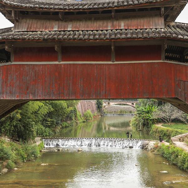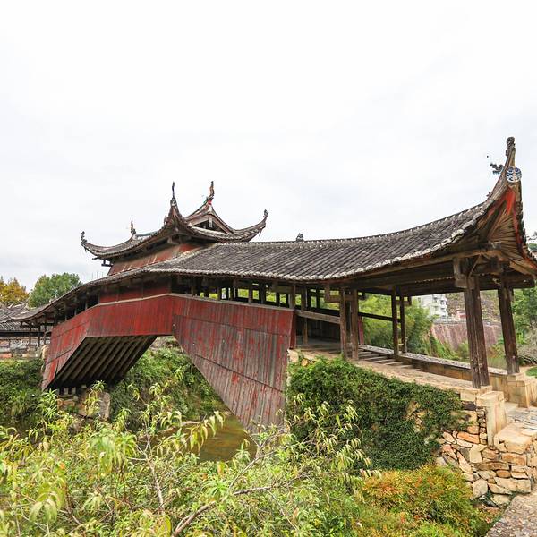 在街道的另一边又是一座历史悠久的廊桥,它与北涧桥合称泗溪姊妹桥,溪东桥初建于元至顺元年,廊桥基本层工艺由编木拱梁而成,外加髹红护板,侧望宛如曲虹,其映水影形酷似倒写‘八’字。在历史上,泰顺村落分散...