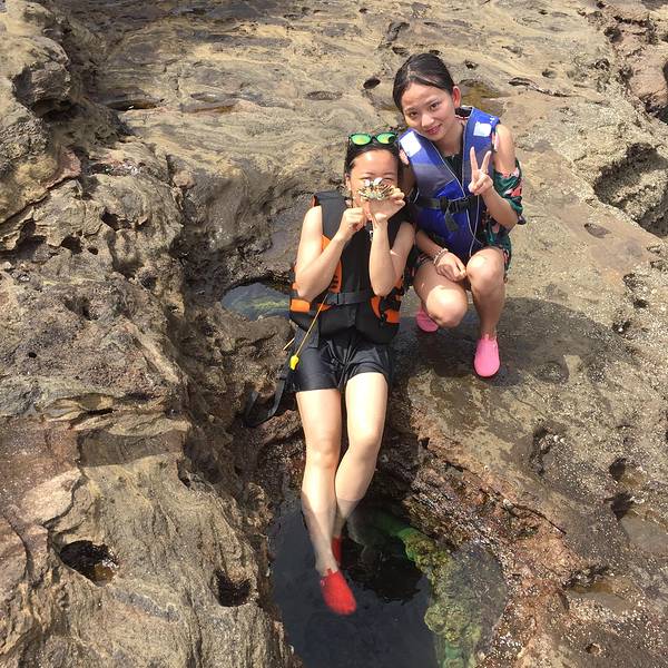 第一次浮潜,我是很激动的哦,刚开始不大会,带队的小杨教了一下,很简单,一下就学会了。两枚浮潜了的漂亮妹子,抓到一只螃蟹,两个人兴奋得哟!!!看吧,这就是斜阳岛的岛花——仙人掌。