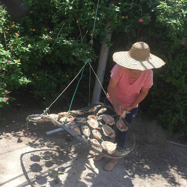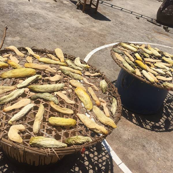 若若的问了一下杨爸爸,每一块都有60斤左右重!这还确实一个很艰巨的工程!!!看到地上的鞭炮了吗,据说由于找不到工人,停工了几个月,然后,又在昨天重新开工了!!!真的好期待下次再来,一定要去住一下!!!大概已经是中午12点左右了,大家可以惬意的躺在小杨家门口的吊床上休息,这个吊床,有一端就是系在大榕树上的!岛上居民自己种的黄瓜,晒成黄瓜干,利于保存,而且据说可以做成一种美味的酱菜!!!这个就是鱼干了,晒鱼干的阿姨就是杨妈妈。