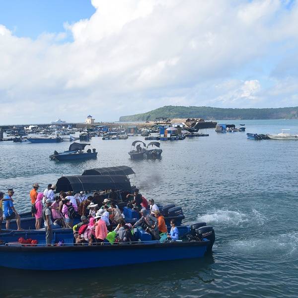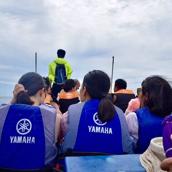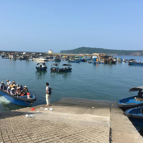 满怀着期待,开始了我的斜阳之行。这个就是快艇了,属于很简易那种的,这个背着黑色包包的男孩子就是小杨。这是些岛上的原住民从涠洲岛回到斜阳岛的时候乘坐快艇的图片。游客也是乘坐这个快艇出发的。