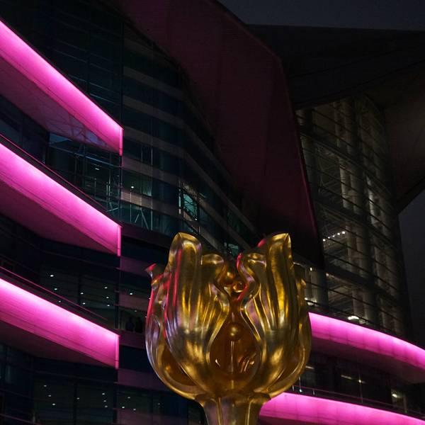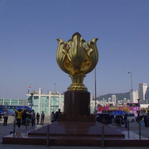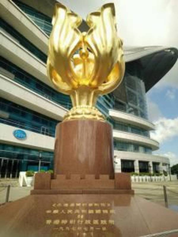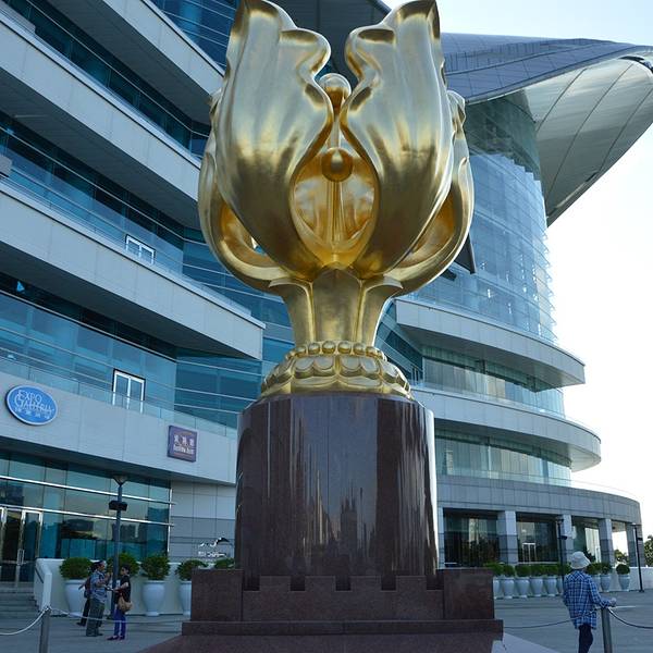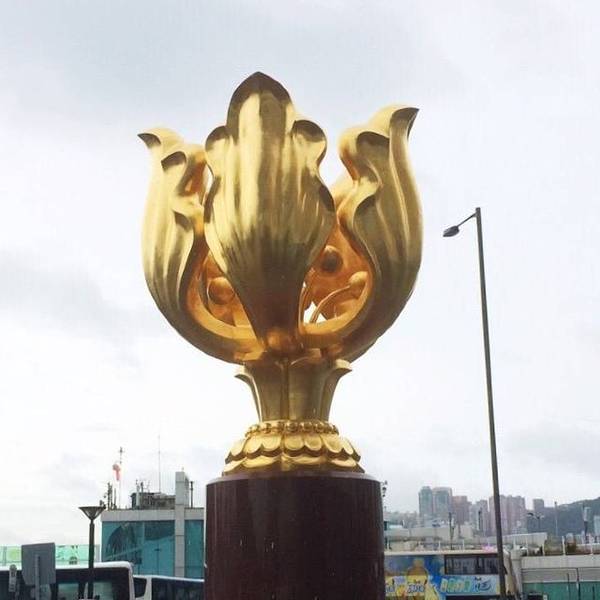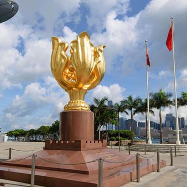 巨大的金色紫荆花铜像,是香港回归的标志性建筑,可观看庄严的升降旗仪式。