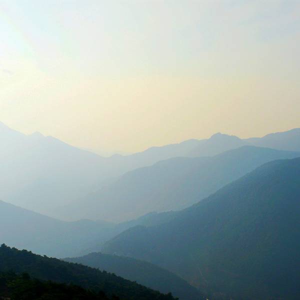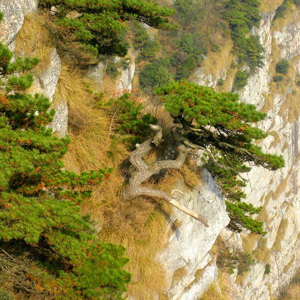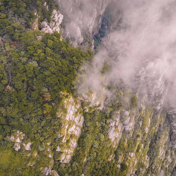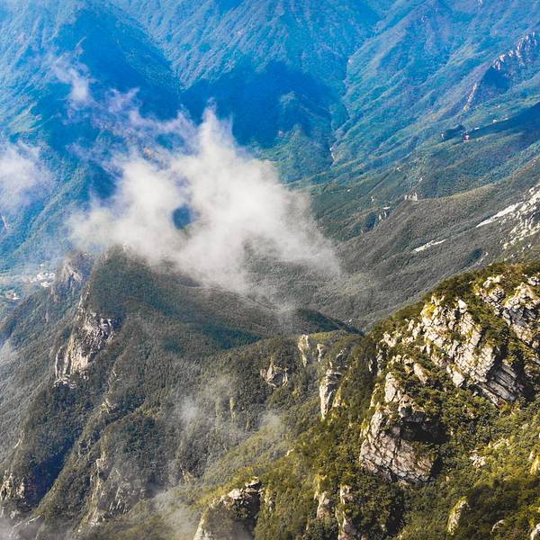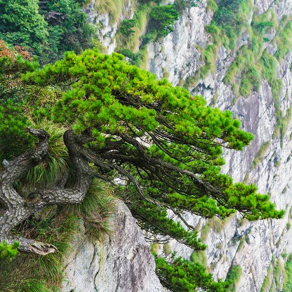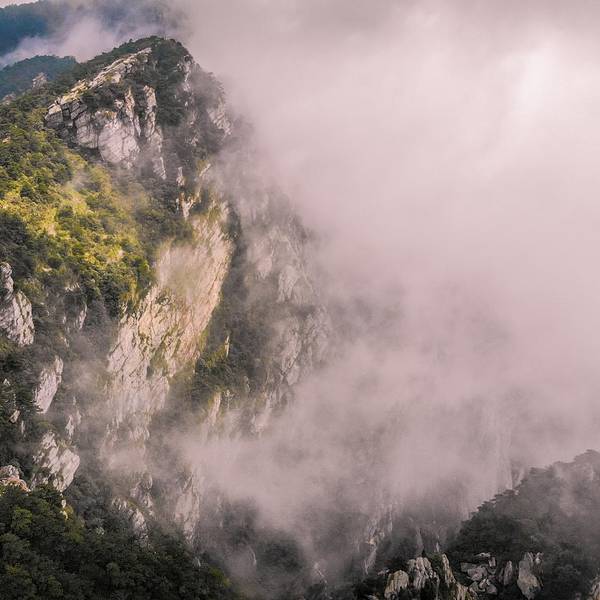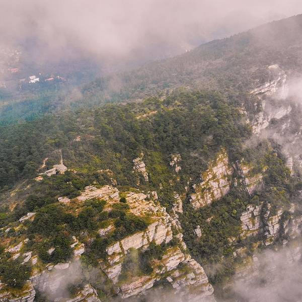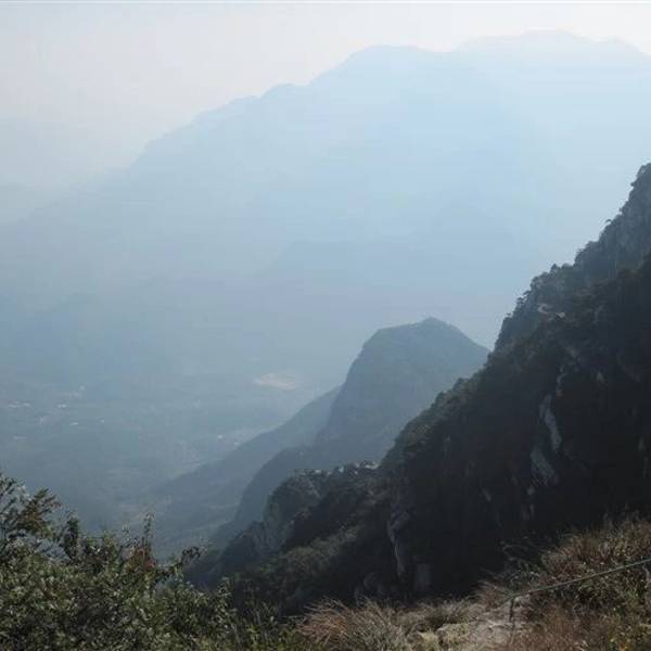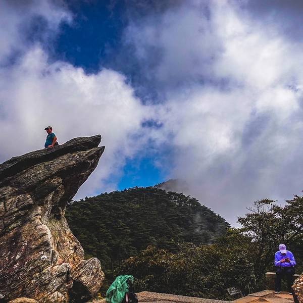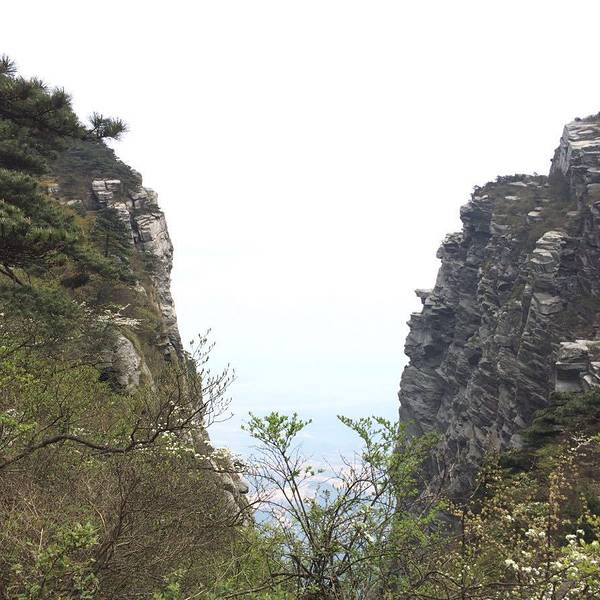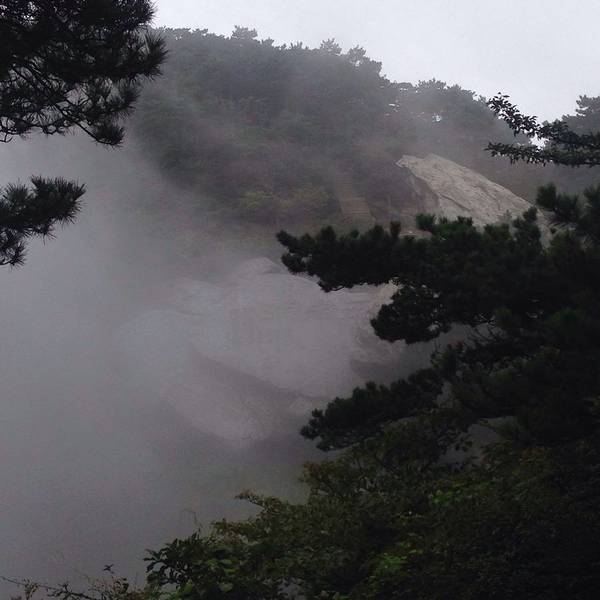 果然,上山的路上,前面看不到人,后面走着走着,一个人都看不到了,上山路照样一眼望不到头,卯足劲儿向上,来到第一峰,无限欣喜。果然五老峰风光无限好,名不虚传。云雾缭绕,就像一副山水画。艺术灵感来源于生活,中国的泼墨山水源头即来源于此。不需要P图,不需要做效果,天生万物,造物主就是艺术家。有4、5人拉着绳索攀岩在悬崖峭壁上采摘野生灵芝、木耳、佛手……