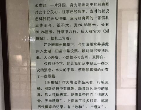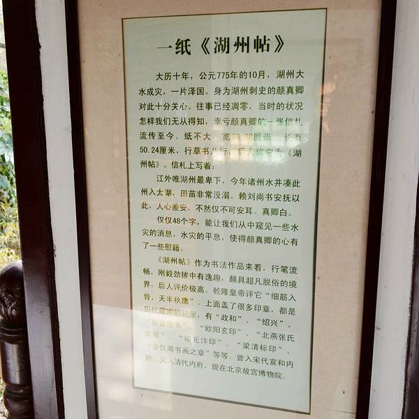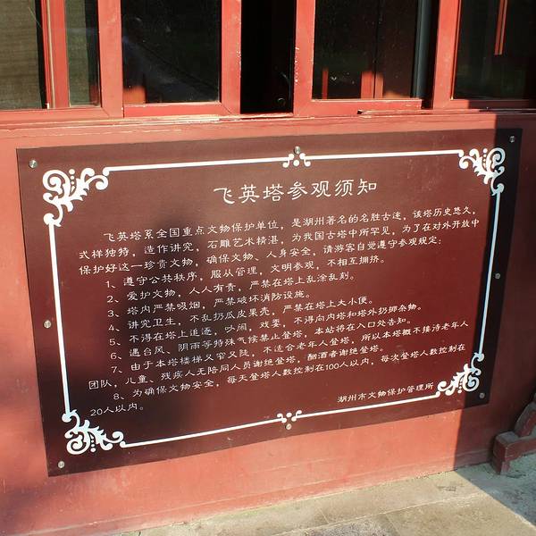 人少,微雨,便会景色幽雅。公园内长廊一处,壁上有介绍颜真卿与湖州的渊源。飞英塔在公园内湖州市区一免费公园,早上滿是锻炼的人们。池塘内开着荷花,有许多人前来摄影。公园内长廊一处,壁上有介绍颜真卿与湖州的渊源。飞英塔在公园内。人少,微雨,便会景色幽雅。