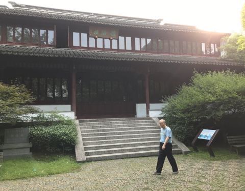 湖州市区一免费公园,早上滿是锻炼的人们。池塘内开着荷花,有许多人前来摄影。公园内长廊一处,壁上有介绍颜真卿与湖州的渊源。飞英塔在公园内。人少,微雨,便会景色幽雅。