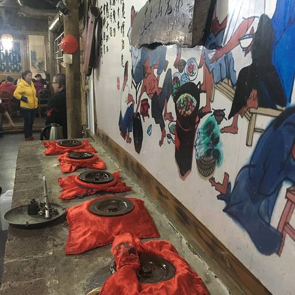 里面的装修风格很有当地特色我们坐在户外,每桌下面有一盆这样的炭火,烤得整个人都是暖烘烘的,炒鸡舒服