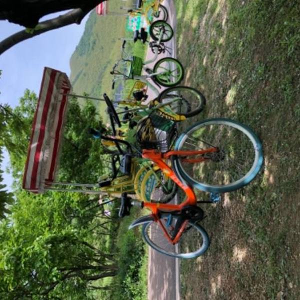 正门口可以租自行车,有山地车跟普通车可选,价格不一样。租的山地车你懂的,价格便宜,问题较多,租普通自行车除了爬坡的时候有点累,反而安全一些。骑完后可以还到林场,也可以放在景区里的农家乐,让农家乐老板联系景区来取。