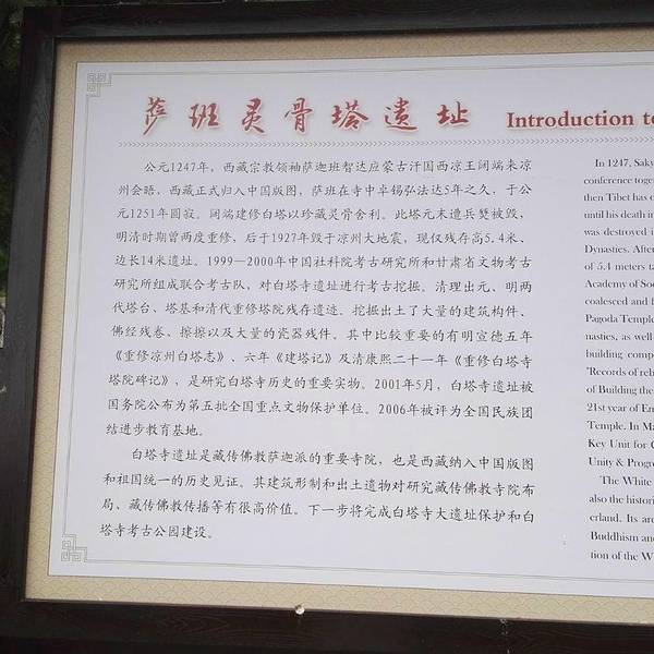 白塔寺遗址位于甘肃省武威市东南20公里白塔村,海拔1500米。白塔寺为元代忽必烈(1260年-1295年)时期藏传佛教萨迦派法王赴凉州会谈西藏统一、并达成协议的居所。