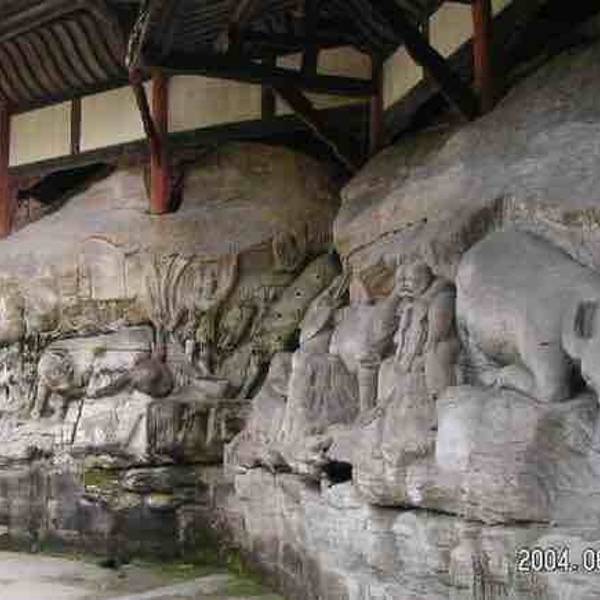 在县西22公里处的季家乡。山上有妙高寺,寺内存祖关通禅师石塔一座和已毁冯揖《忠诚堂诗碑》一通。寺外石岩下,有石窟造像2处,一日佛洞,一曰猫猫岩,共有造像12窟。佛洞第二号“三教”窟,释迦佛坐莲台,下雕蟠龙,两旁有迦叶、阿难二夹待,为佛像。左壁坐像,博衣阔袖,足着靴,高合髭须,执奋,二伺者为道像。右壁坐像,圆顶,大袖,戴冕垂流,执济,左右各一侍者,为儒像。这种典型的三教窟,在大足少见,在全国更珍贵。