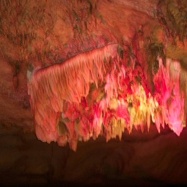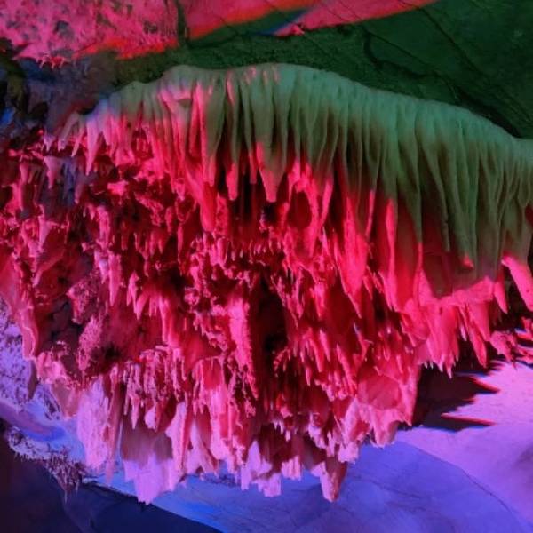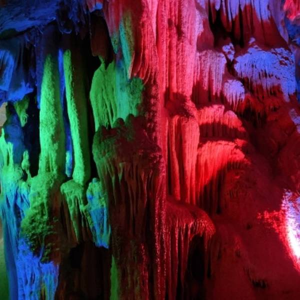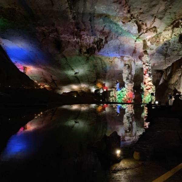 在九霄碧云洞中看千姿百态的钟乳石,乘电动竹筏游岩岭湖。