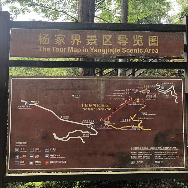 旅程第二天行程是杨家界和袁家界,自由行的朋友,记得带上地图哦。我们原计划是在三岔口停车场坐车到金鸡报晓停车场,游玩路线本来是:杨家界的金鸡报晓→鬼门关→乌龙寨-天波府→一步登天→空中走廊→奥运火炬→回停车场;然后再在停车场坐车到袁家界天下第一桥停车场,天下第一桥→阿凡达悬浮山→迷魂台→回停车场。