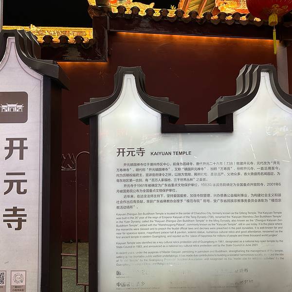 潮州开元寺说是中国现存的四大开元寺之一,各朝文物留存也多,但不需门票,真好“大悲殿”,饶宗颐所书。牌坊街有饶宗颐学术馆及其故居。潮州开元寺说是中国现存的四大开元寺之一,各朝文物留存也多,但不需门票,真好。石经幢。石柱风化明显,开元寺始建时所造,已历一千二百馀年。阿育王式...“大悲殿”,饶宗颐所书。牌坊街有饶宗颐学术馆及其故居。潮州开元寺说是中国现存的四大开元寺之一,各朝文物留存也多,但不需门票,真好。石经幢。石柱风化明显,开元寺始建时所造,已历一千二百馀年。阿育王式塔,颇有年代。大雄宝殿广场有两棵菩提树,枝繁叶茂。 展开