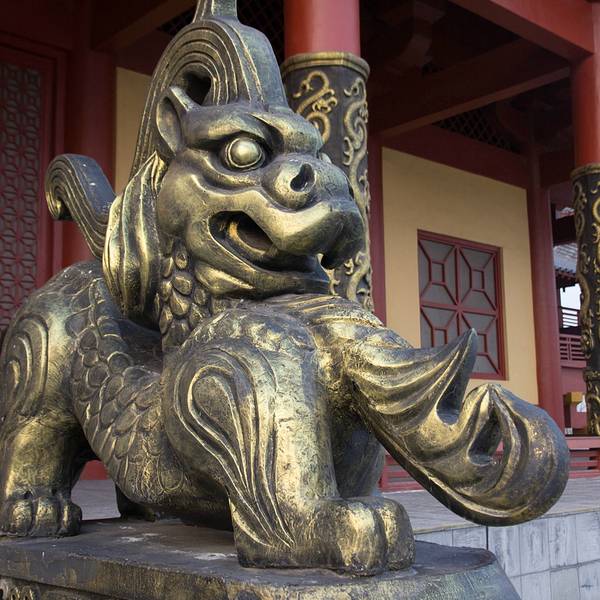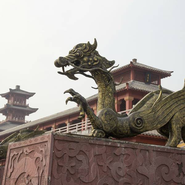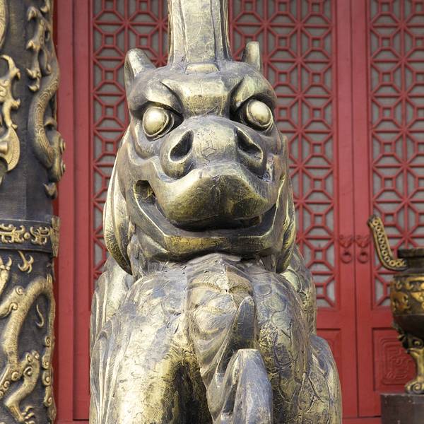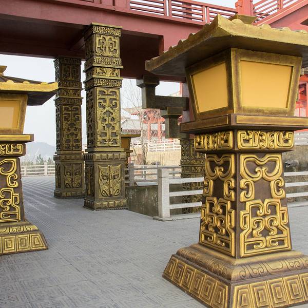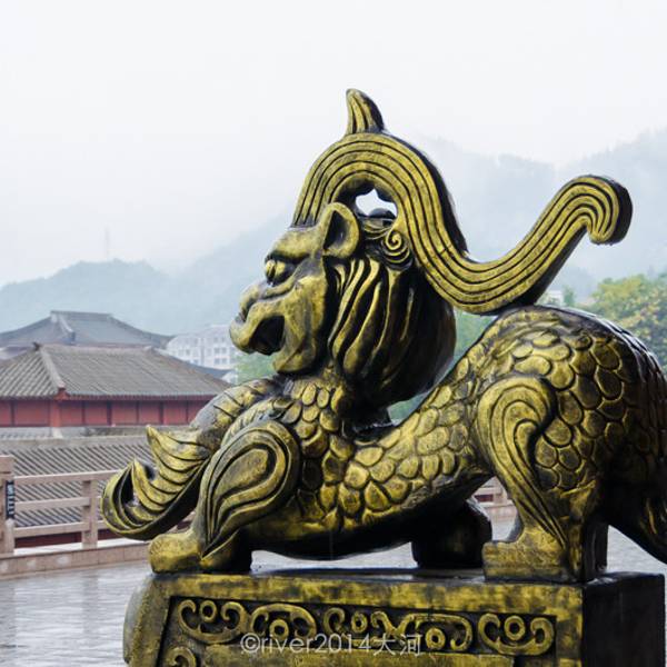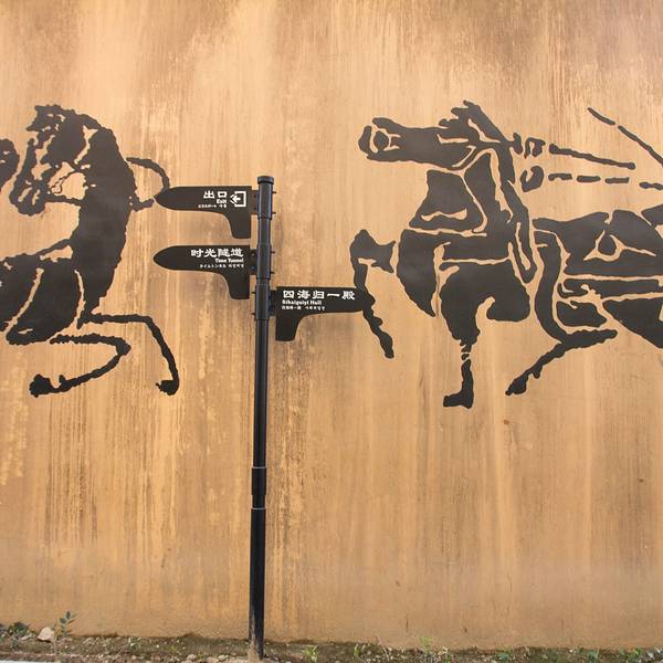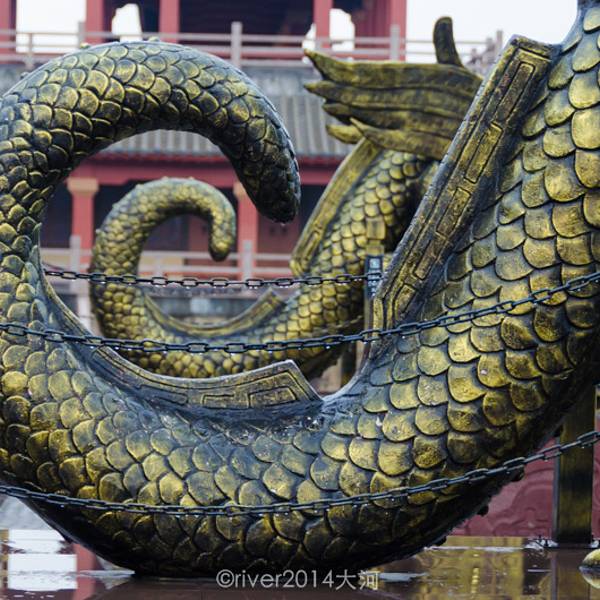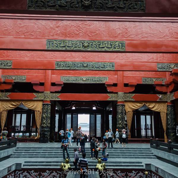 进入景区后,是一个巨大的广场,两边种植着大片的草地,让人赏心悦目,游客只能从草地中间的通道前行进入大殿。在通道两侧以及大殿之前都有许多塑像,有龙,也有各种动物,神态威猛,感觉古朴沧桑。进入到大殿内,这才是景区的核心,在秦王的座位上可以拍照。殿里高大的柱子让人感觉到渺小。